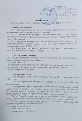 Организаторы: ОГКУ "УСЗН по г. Иркутску". Партнеры: - Региональное отделение Иркутской области Политической партии " Новые люди"; - Благотворительный фонд охраны окружающей среды " ЭКОСФЕРА ". Работы в формате А4 или в виде фото или цветного скана на электронную почту управления: На обратной стороне рисунка или в эл. письме указать ФИО ребенка, возраст, номер телефона родителя и электронную почту. Участники награждаются сертификатом, победители призами. Работы принимает отдел по работе с участниками СВО и членами их семей с 1 декабря по 12 декабря 2025 г. включительно.